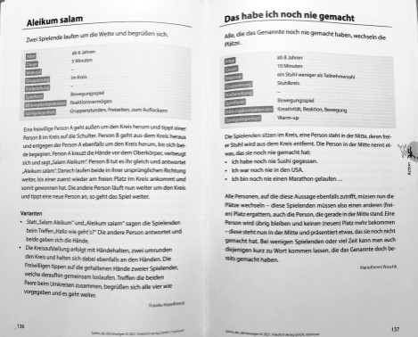 Die Spiele fördern das soziale Lernen, die Kreativität und alle Gestaltungsfähigkeiten. Kleine spontane Spiele bis hin zu großen Spielaktionen für die Kindergruppe und für schulische Situationen. Über 270 Seiten mit zusätzlichem Downloadmaterial! Blick auf eine Buch-Doppelseite!