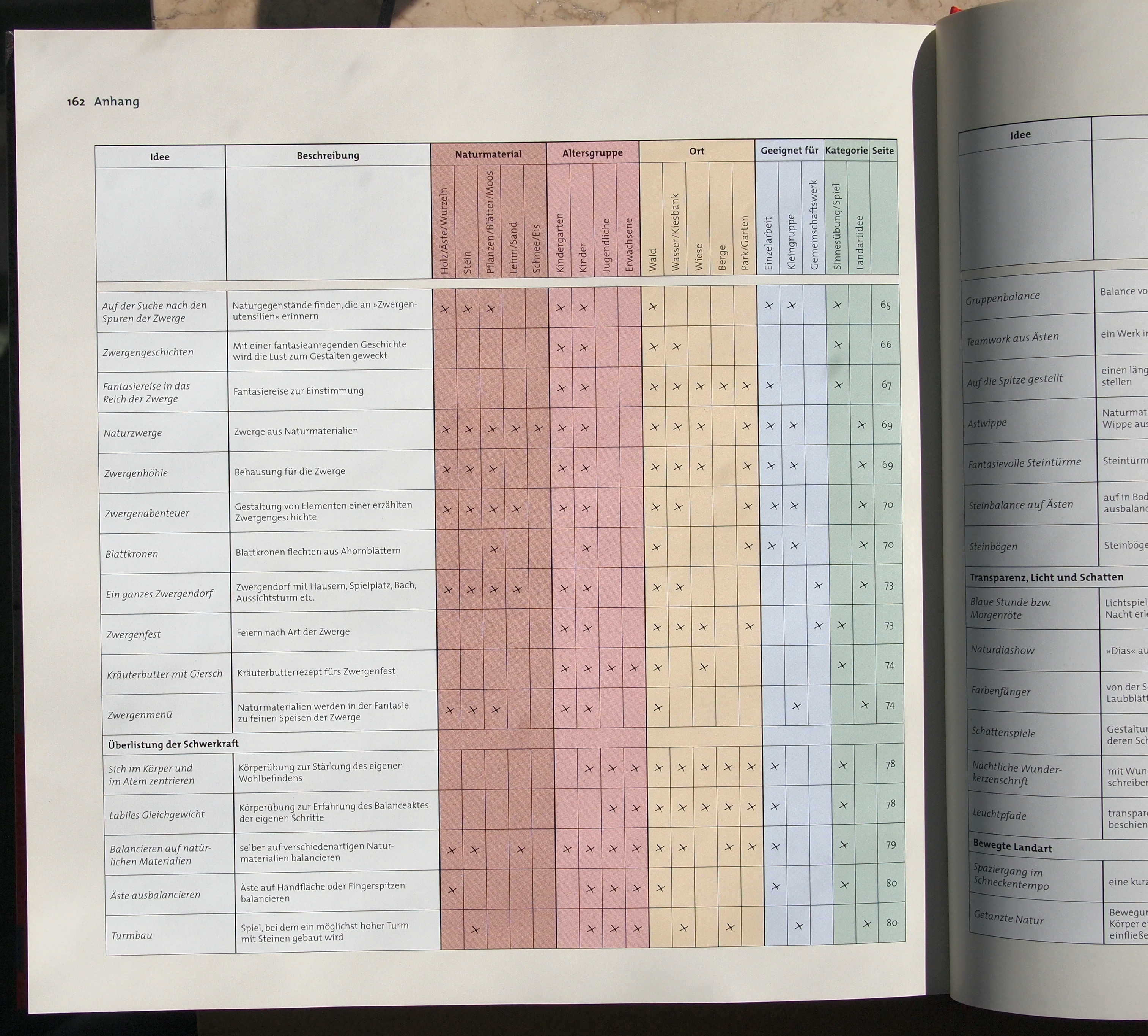 Impulse für den Einsatz von Landart an der Schule, auch über den Kunstunterricht hinaus, z.B. als Methoden für Team- und Gruppenbildung oder in der Persönlichkeitsentwicklung. Auf einer übersichtlichen Matrix werden die Anwendungsmöglichkeiten jeder Methode dargestellt - davon hier eine Beispielseite: Blick ins Buch 2.