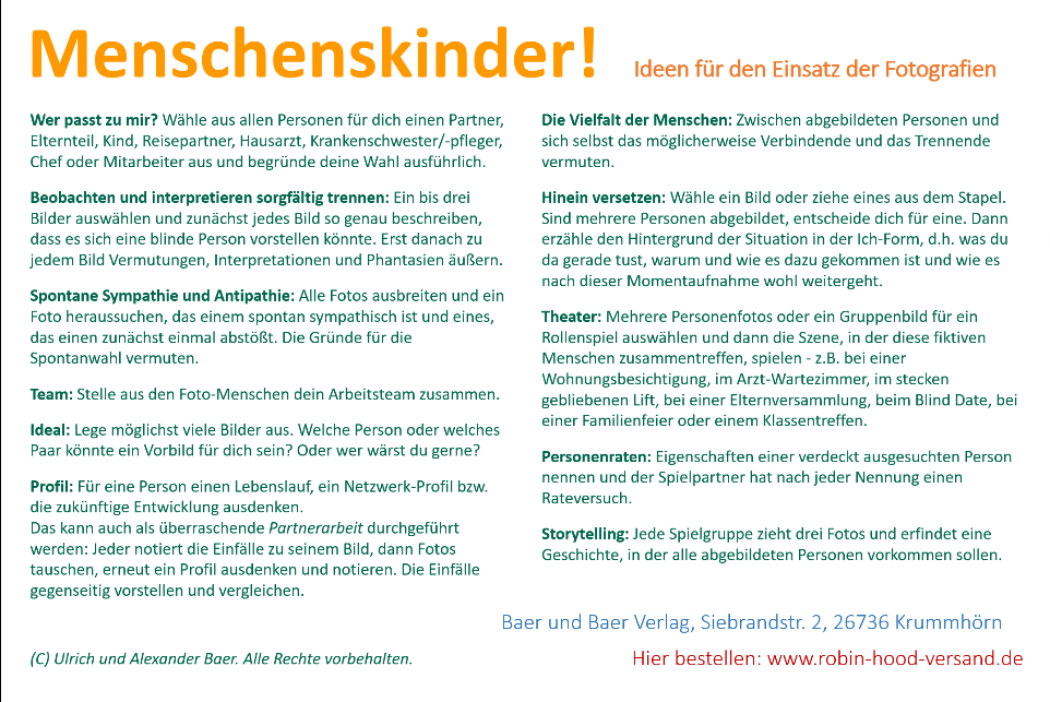 Die Teile dieses Sets enthalten Fotos von Menschen aus allen Altersgruppen, bunt gemischt: männlich, weiblich, aus verschiedenen Ländern, im Alltag oder auch in recht kuriosen Situationen. Immer gut dazu geeignet, sich in die Leute hinein zu versetzen, die eigene Empathie und Phantasie zu stärken.